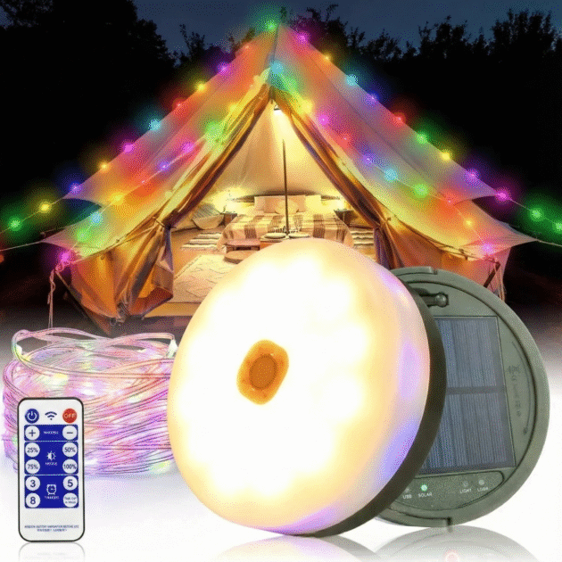 حوّل أي رحلة تخييم أو سهرة خارجية إلى أجواء دافئة ومنوّرة مع مصباح التخييم الشمسي 2 في 1 — مصباح قوي + شريط إنارة مرن في جهاز واحد!