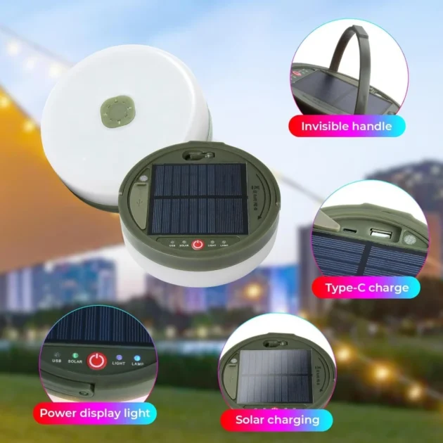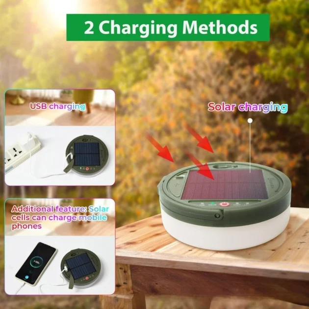 مزود ببطارية قوية تدوم حتى 3 ساعات على وضع الإضاءة القوي، مع إمكانية إعادة الشحن بالطاقة الشمسية أو عبر USB لضمان استعمال أطول أثناء التخييم والرحلات.